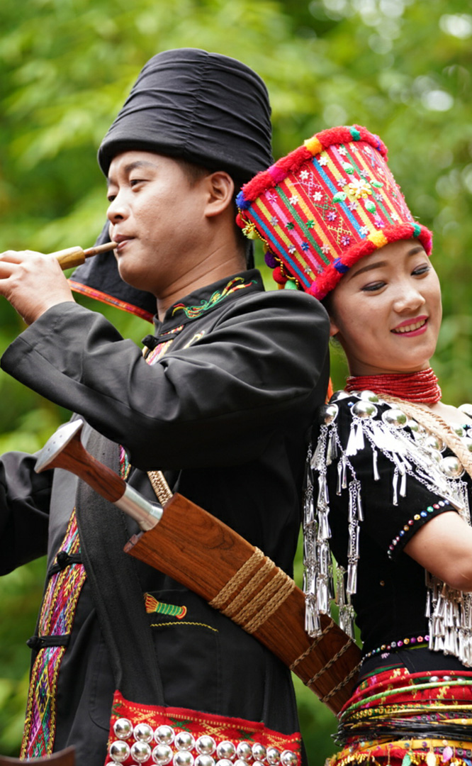 德昂族人口約1.7萬,主要分布在德宏州和保山市的潞西、梁河、瑞麗、隴川、隆陽等縣區(qū)。民居多為草排覆頂竹木結(jié)構(gòu)的干欄式建筑,眼前的德昂村建筑納入了能容納數(shù)十人居住的德昂大房子,氈帽頂?shù)男》孔樱€有頗具浪漫色彩的大公房、小公房……還建有“龍陽塔”標(biāo)志及佛教奘房、佛塔。德昂族民間普遍信奉南傳佛教,民俗活動(dòng)與佛事活動(dòng)關(guān)聯(lián)緊密。潑水節(jié)、開門節(jié)、關(guān)門節(jié)是重大節(jié)日。德昂族服飾色彩豐富,口頭文學(xué)特別是民歌創(chuàng)作活動(dòng)...